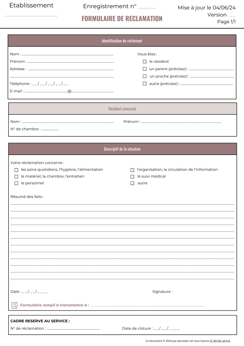 Formulaire permettant de recueillir les réclamations des résidents et/ou de leurs proches.