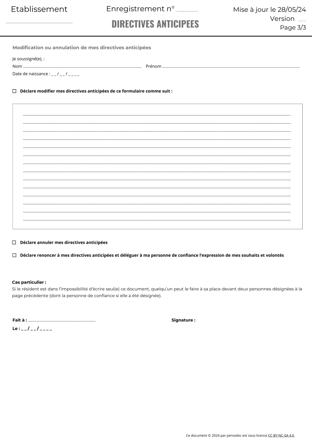 Possibilité de faire signer le document par 2 témoins si le résident n'est pas en capacité d'écrire. Il est également noté à quel(s) endroit(s) peut se trouver ce document.
